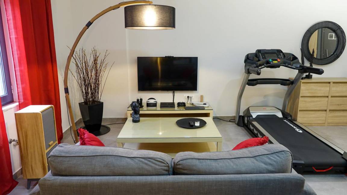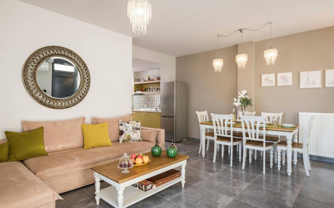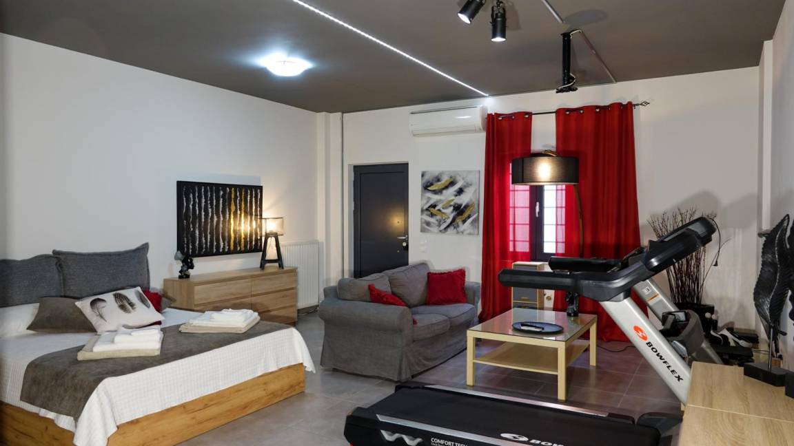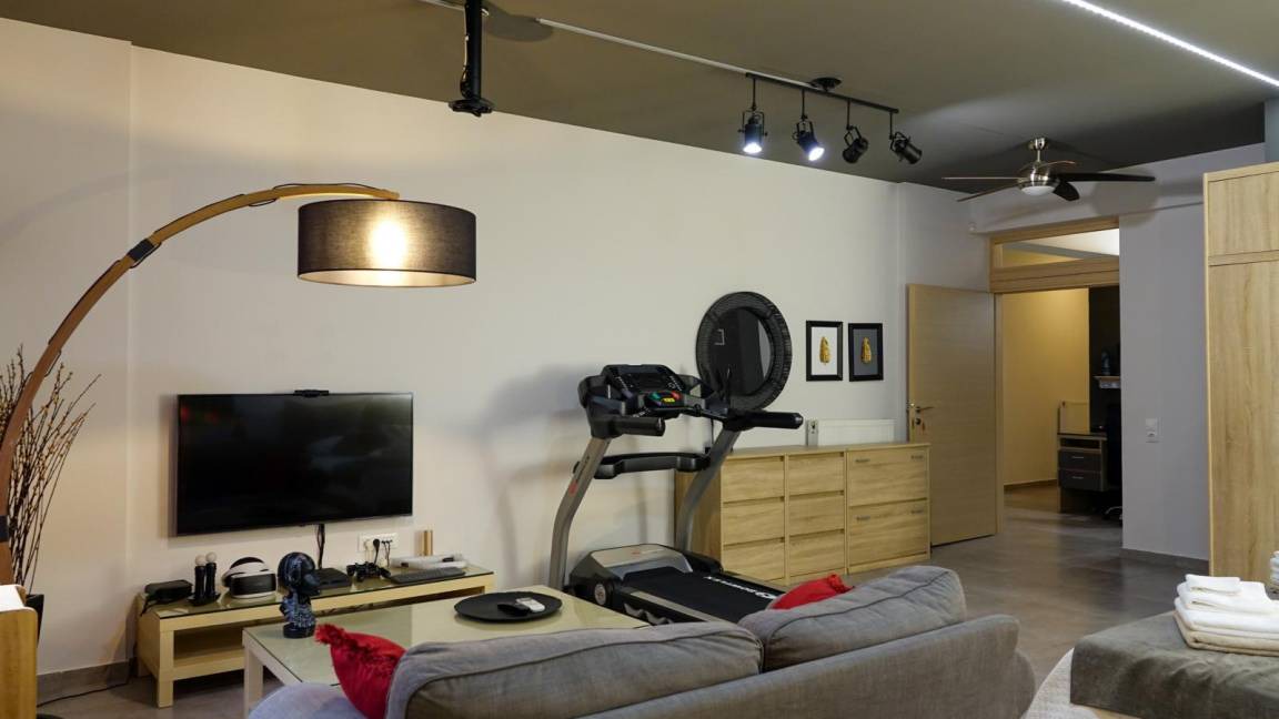 On the ground floor you will find the living room with a modern L shaped sofa, a wooden coffee table, and a 65" LCD Smart TV with Netfix DVD player and PS4. The open space area has a modern fireplace and unique furniture design making the open plan space an oasis of elegance and luxury. On this level you can find 3 of the bedrooms, with each one having a view to the pool area with a unique decoration. The master bedroom has a king size bed with anatomic mattress and pillows, an LCD TV, a glass made shower cabinet for two persons with hydrojet towers next to the bed, a round grand bath, facing the wonderful view, access to a furnished balcony, an en suite bathroom with toilette and sink. A separate space, designed as a boudoir, equipped with styling stuff, a large mirror and a closet. The other 2 bedrooms with each one having a unique decoration and an airy atmosphere are ideal for your body and mind to enjoy the ultimate relaxation. Both bedrooms have king size beds, LCD TVs, modern mirror commodes, spacious closets. There is also access to a furnished balcony, overlooking the pool area and the city. There is also a bathroom with shower on this level.