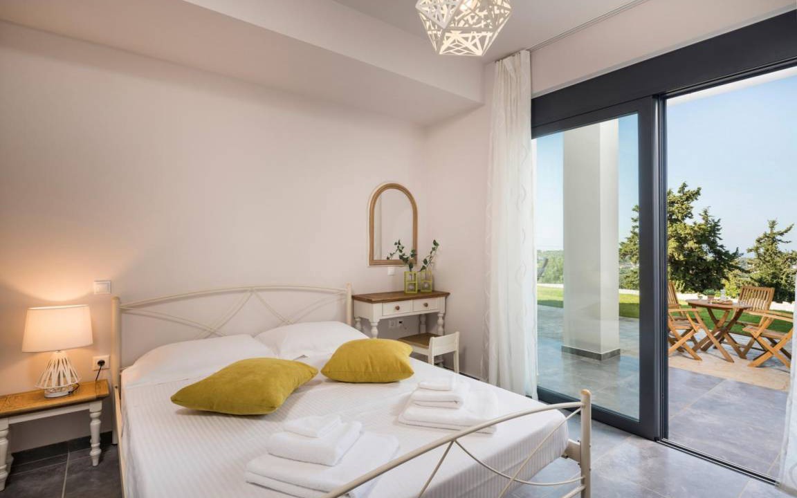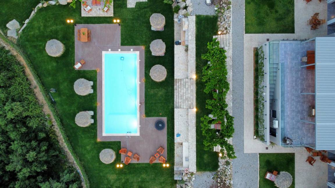 The exterior spaces of the villa consist of a private heated pool. Swimming or sunbathing in the big pool is an experience that satisfies every single sense, as the surrounding landscape and the view are extraordinary. By the pool you will find outdoor shower, plenty of elegantly furnished spots to enjoy a refreshing juice, a coffee or a cocktail.