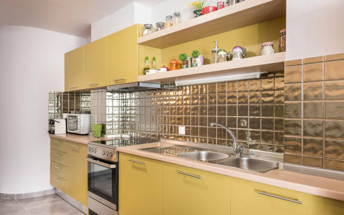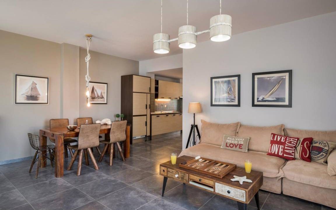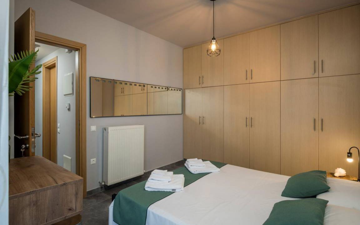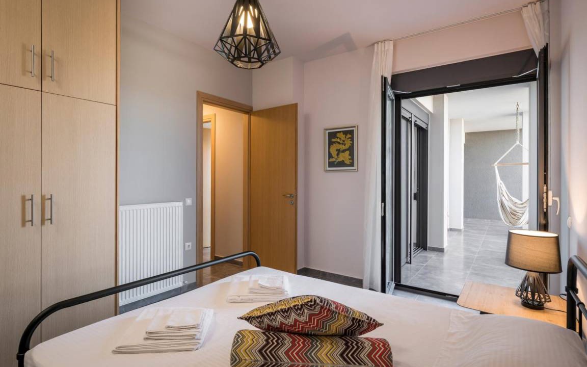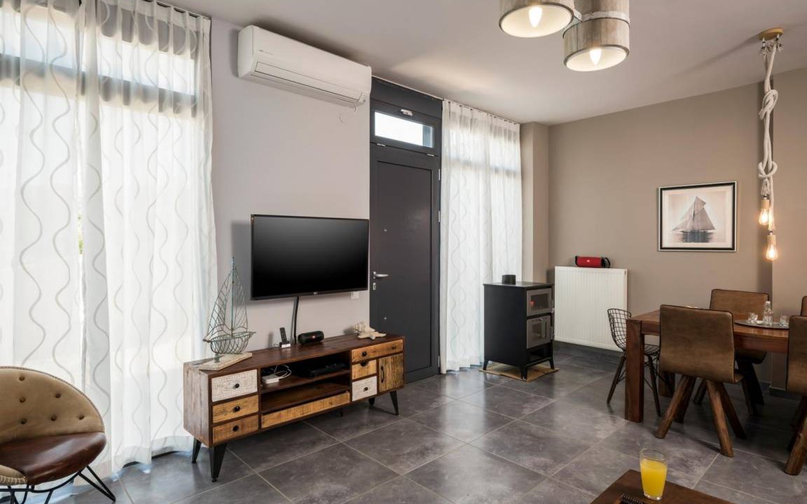 The other four bedrooms are separated in two independent, fully furnished and equipped buildings. Each building has 2 bedrooms and are located in the ground floor of the villa, with separate entrances from the main one. They also have an open plan space with living room, dining area, kitchen, a full bathroom. All 4 bedrooms feature king size beds. The bathrooms are equipped with sink, toilette, spacious bath with shower and washing machine. Both apartments feature wall to wall doors, offering access to the pool and one of the terraces of the villa, furnished with a super modern swing, a hammock and a dining table. A table football is also placed in the terrace to offer you some moments of fun, on your breaks from swimming and sunbathing.