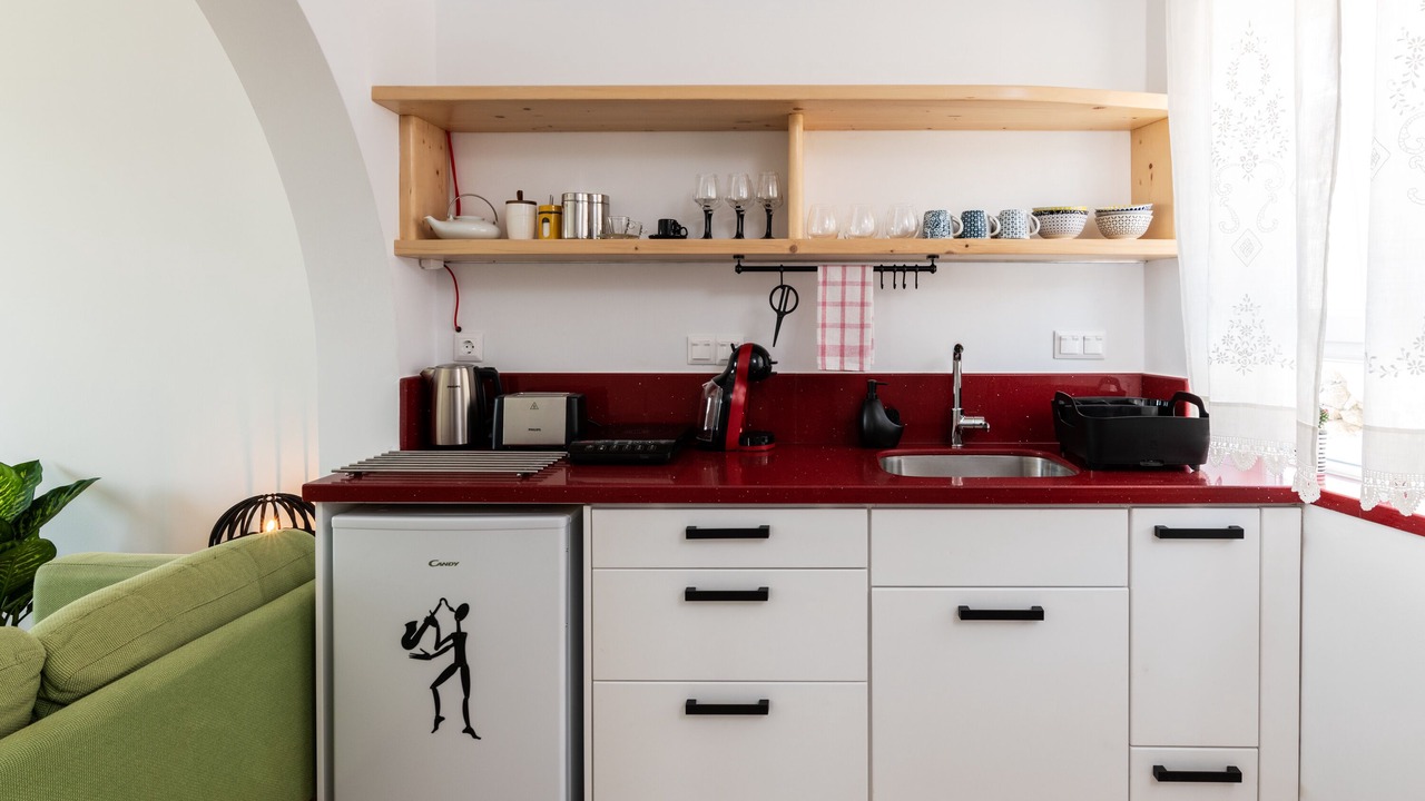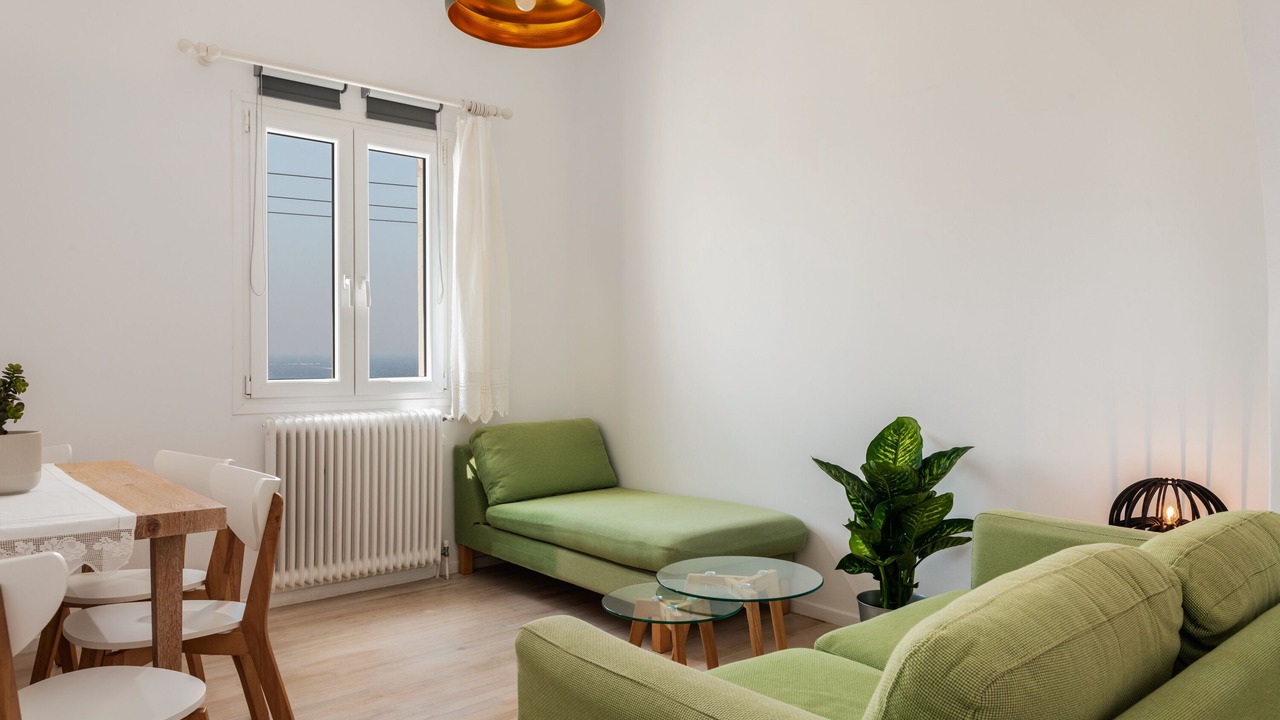Οι κοινόχρηστοι χώροι αποτελούνται από μια ανοιχτή κουζίνα και ένα καθιστικό με ένα υπέροχο παράθυρο με θέα στη θάλασσα.