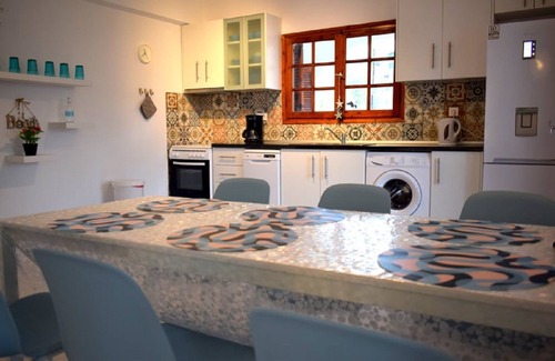 Beim Betreten der Unterkunft befindet man sich direkt in einem hellen, offenen Wohnzimmer , eingerichtet mit einerSitzecke mit Sofa und einem großen LED TV, einen Eßbereich mit langem Tisch und eine Küchenzeile ausgestattetmit großem Kühlschrank, Geschirrspüler und Waschmaschine.