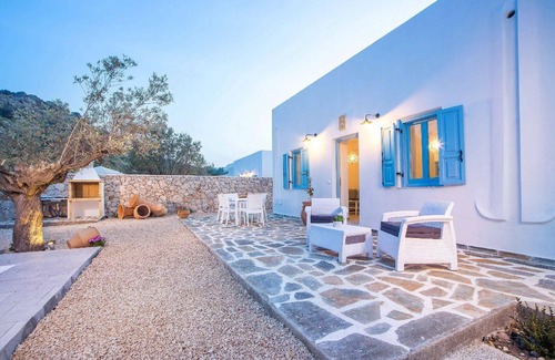 White Dream villa has 2 wonderful bedrooms; the one is with a double bed and the other with two single beds. All bedrooms are tastefully decorated in a traditional way and have doors that lead outside the house and the swimming pool. Also, there are 2 bathrooms, each one with a shower. There’s a modern kitchen, fully equipped for any meal preparation along with a sitting area. Also, there’s a cozy living room in blue tones with a screen TV. Outdoors, there’s the exquisite private swimming pool with its sunbeds for your ultimate relaxation. The surrounding area is pretty inviting, guests of the villa will breathe the fresh air of Greek nature and relax under the Aegean sun. Also there’s a modern sitting area and BBQ facilities.