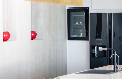 The main entrance welcomes you to an open living space featuring the living room with a cozy corner sofa, 55 HDTV with Netflix, A/C, Marshall bluetooth speaker on your right that offers direct access to the BBQ area and outdoor dining area. On your left the fully equipped kitchen, with built-in appliances, island counter with 4 stools and wine cooler and adjacent indoor dining area for 6, provide all essentials for your self catered holiday. A utility room next to the kitchen offers a washer/dryer as well. The living room, kitchen, as well as two of the bedrooms, open out to the private swimming pool and sunbathing terrace.