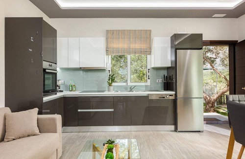 There is ample private parking space for up to 10 cars on the premises • The property is well-equipped with all the mod cons; Fridge with freezer, Electric stove with oven, Espresso machine, Frappe machine & Filter coffee machine, Food Processor (Multi), Juicer, Kettle, Sandwich Maker, Dishwasher, Washing Machine, Iron & Board, Hair dryer, open plan fully equipped kitchen, Safety Box, First Aid Kit, Alarm System, Fire Extinguisher, Smoke Detector.