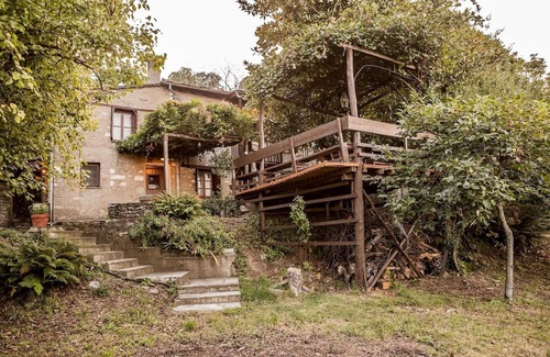 Melia Cottage is a 19th century, two-storey, traditional house meticulously restored with much respect to its historic character. The ground level is composed of a spacious living room containing a three seater sofa / two single beds, a large table, two chests, and a cast iron wood burning stove, a fully equipped kitchen, a laundry room where a dishwasher is also placed and a bathroom (toilet, sink, and shower). As for the upper level, there is a living room, furnished with authentic pieces: chests, wardrobe, country sofa, fireplace, etc. It also includes a single bed. This space is connected to a double bedroom with a wardrobe, and a commode with mirror (there exists a second fireplace). There is also a larger bathroom (toilet, sink, and shower). The house offers splendid sea and mountain views. On a day with good visibility, several Aegean islands and Athos peninsula can be clearly seen. In the yard, there are flowers (many of them of bright colors), aromatic herbs, many fruitful trees, and a vegetable garden (guests can pick up everything they desire). Two masonry barbecues are built for outdoor cooking. Besides the stove and fireplaces, the house is equipped with hot water radiators (the system uses oil for combustion). There is a good internet connection through a wireless router. The property has a driveway and a parking space for two vehicles, connected to the house by a paved and lit path.