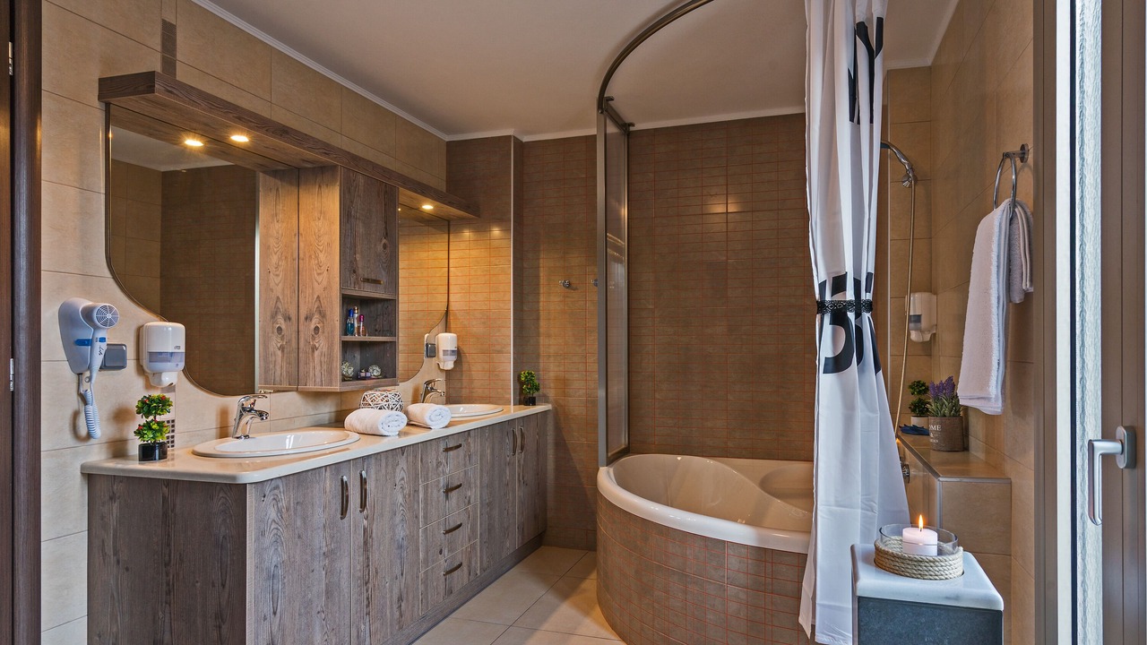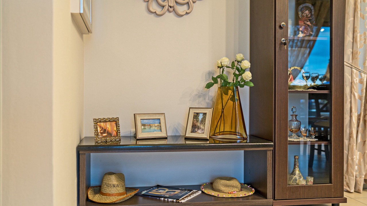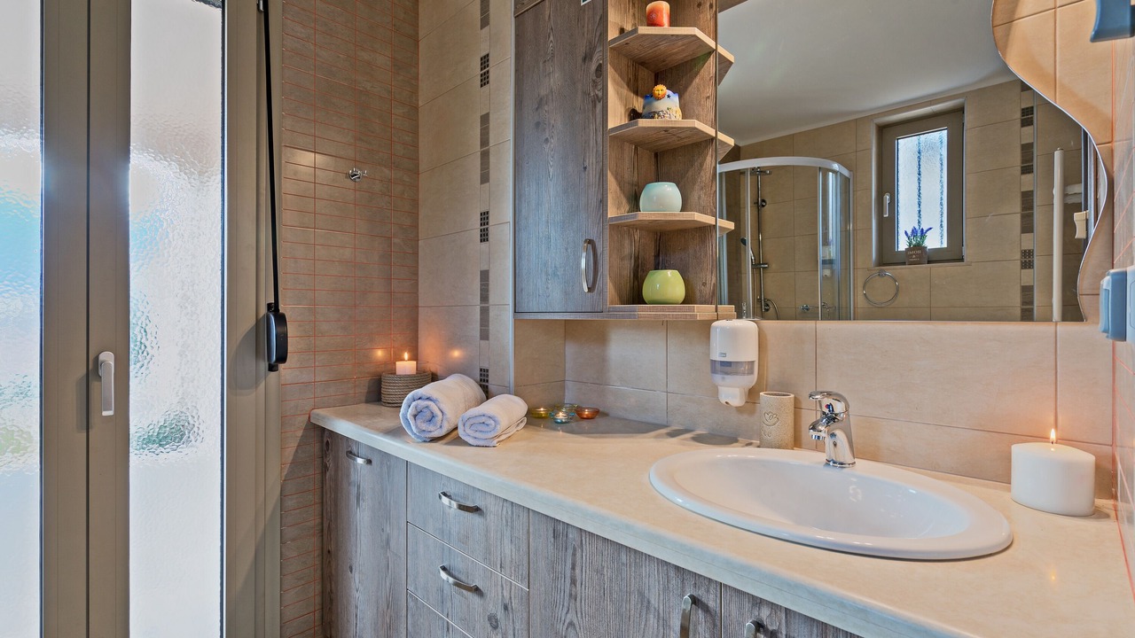 On the first floor you will meet all the 3 bedrooms. All of them have a big double bed, a huge wardrobe, television and a dressing table. On this floor you will also find a huge bathroom with a big tub and all the luxury you will need. The balconies of the first floor will offer to you an amazing view to the nature nearby, the village and the sea, as you can see by yourself in the photos.
