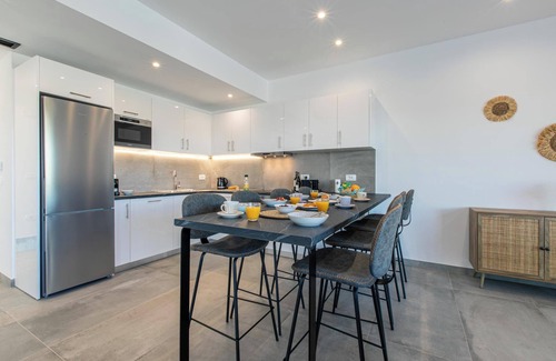Ground Floor: Open plan kitchen/ living/ dining area (A/C, Smart TV, WiFi, oven, microwave, dishwasher) with patiodoors to terrace. Double bedroom (A/C) with en suite shower room and patiodoors to private terrace. Double bedroom (A/C) with en suite shower room and patiodoors to terrace. Cloakroom. Lower Ground Floor: Doublebedroom (A/C). Shower room. Utility room(washing machine). TV room (Smart TV). Outside: Sun terrace. Dining terrace. Private parking. In-built barbecue. Private infinity edge swimming pool (8.4m x 3.9m) with uniform depth of 1.5m