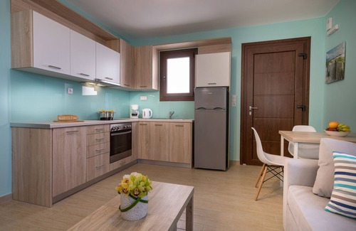 The decoration of interior harmonizes with the surrounding colors, making the visitors to maintain a contact with the elements of the wild Cretan landscape. The apartments have 1 bedroom with elegant minimalist aesthetic. The kitchen is fully equipped with the necessary for preparing a meal. In the spacious living room the comfortable sofa or the large and comfortable dining room will give visitors the opportunity for relaxation. The spacious terrace (20 sqm) have a direct view of the sea and make the guests to enjoy every moment of the day either by sitting in comfortable chairs or by sunbathing on loungers!
