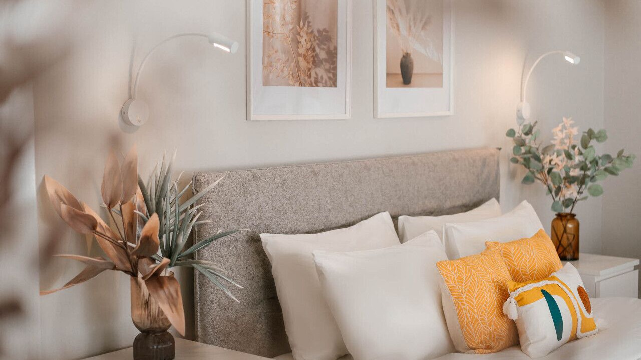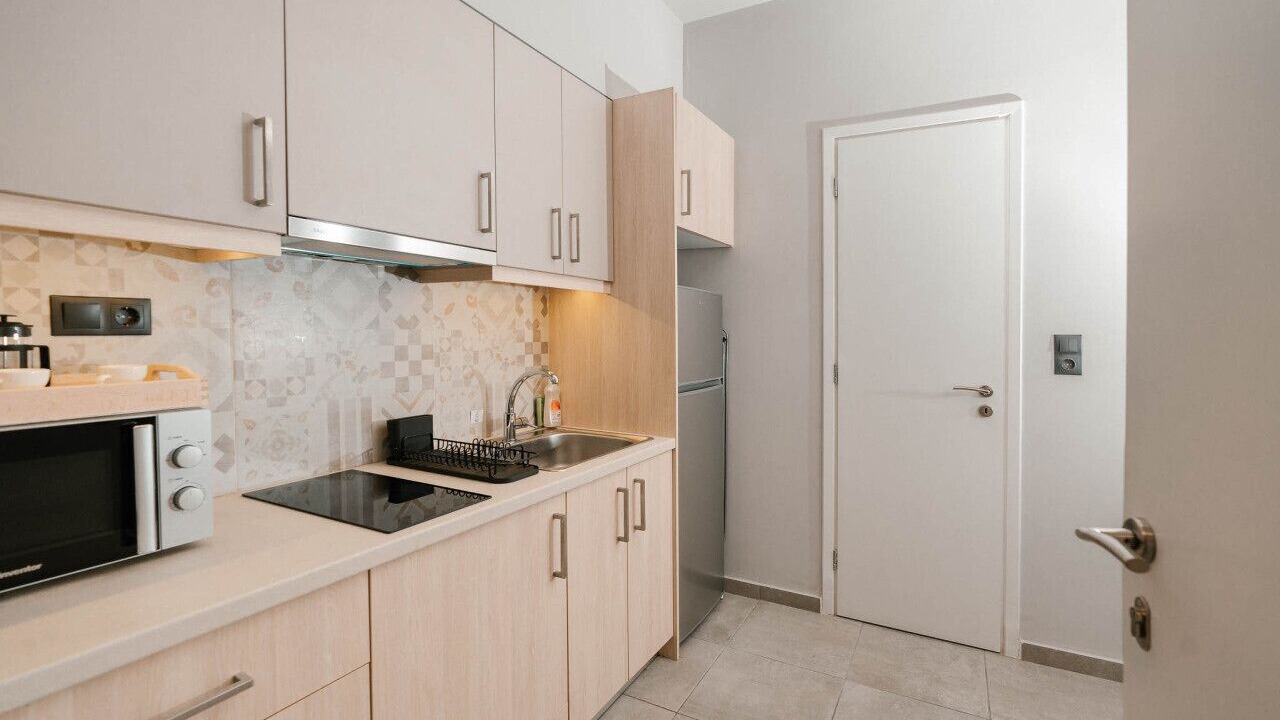 On your left, a fully equipped kitchen awaits your culinary endeavors, while ample wardrobe storage on your right ensures convenience and organization during your stay.